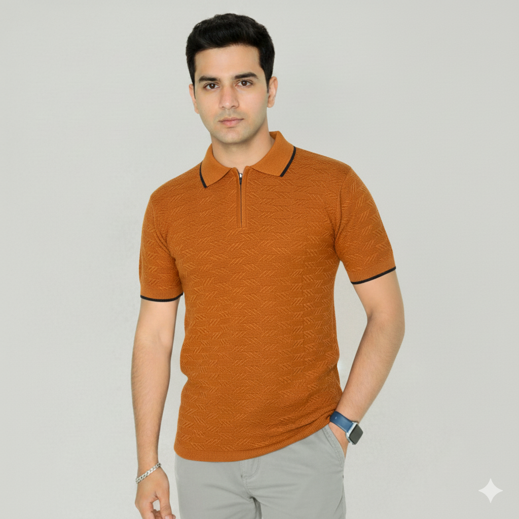 The bold Sunburst hue, inspired by golden sunsets and citrus energy, adds a dynamic touch to your wardrobe. Featuring a sleek zip-up collar, this polo offers a modern, sophisticated edge, allowing you to transition effortlessly from casual outings to refined summer evenings.